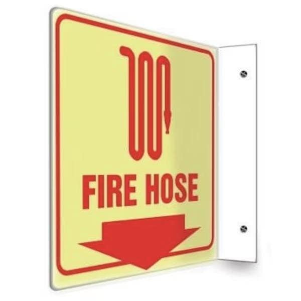 Accuform Projection Sign, 90D, Header NO Header, Legend FIRE Hose ARROW DOWN, 01 in LumiGlow Plastic, 8 in Height, 8 in Width Projection Signs provide identification, location, and direction that can be easily seen from various angles for extra visibility