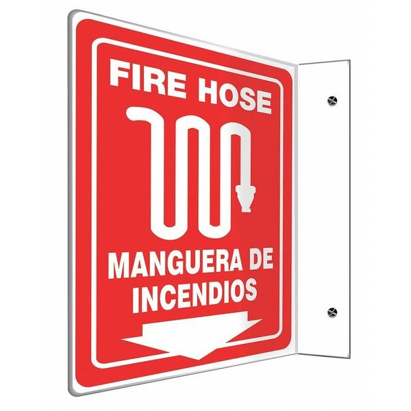Spanish-Bilingual L-Shape Projection Sign, Sign Subject Matter Fire Equipment, Height 12 in, Width 9 in, Sign Material Plastic, Sign Mounting Style With Mounting Holes, L-Shaped, Header No Header, Legend Fire Hose/Manguera De Incendios, Printed Language English, Spanish, Sign Shape L-Shaped