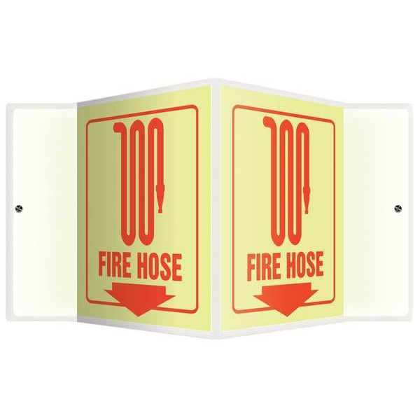 Fire Hose Sign, Sign Subject Matter Fire Equipment, Height 6 in, Width 8 1/2 in, Sign Material Plastic, Sign Mounting Style With Mounting Holes, V-Shaped, Header No Header, Legend Fire Hose, Printed Language English, Sign Shape V-Shaped
