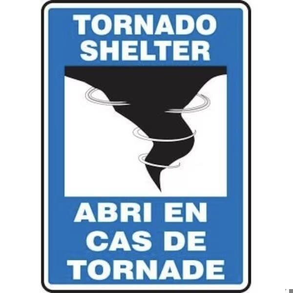 Accuform Fire Sign, Bilingual, Legend TORNADO SHELTER WGRAPHICABRI EN CAS DE TORNADE, 4 mil Vinyl, 24 in Height, 18 in WidthSafety Signs identify and indicate potential, type, and degree of hazards that may lead to accidental injury or property damage Adhesive Vinyl is the ideal choice for a variety of indoor, and sheltered outdoor, marking needs Easily mounts to all curved areas such as pipes, poles, and secondary containers Adhesive Vinyl signs feature a printed matte surface, moistureresistance, and scored backing for quick peeloff and application
