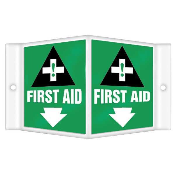 V-Shape Projection Sign, Sign Subject Matter First Aid, Height 6 In., Width 8-1/2 In., Sign Material Plastic, Sign Mounting Style With Mounting Holes, V-Shaped, Header No Header, Legend First Aid, Printed Language English, Sign Shape V-Shaped