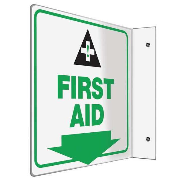 L-Shape Projection Sign, Sign Subject Matter First Aid, Height 8 In., Width 8 In., Sign Material Plastic, Sign Mounting Style With Mounting Holes, L-Shaped, Header No Header, Legend First Aid, Printed Language English, Sign Shape L-Shaped
