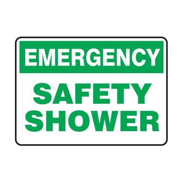 Accuform First Aid Emergency Sign, Rectangle, Header NO HEADER, Text Legend, Legend EMERGENCY SAFETY SHOWER, Aluminum, Surface Mounting, 10 in Height, 14 in Width, Green on white LegendBackground