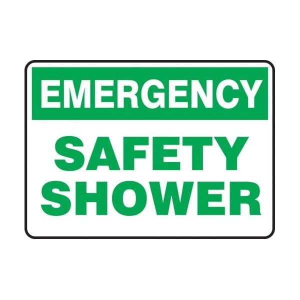 Accuform First Aid Sign, Rectangle, Header NO HEADER, Text Legend, Legend EMERGENCY SAFETY SHOWER, 4 mil Adhesive Vinyl, Adhesive Surface Mounting, 10 in Height, 14 in Width, GreenWhite on GreenWhite LegendBackgroundSafety Signs identify and indicate potential, type and degree of hazards that may lead to accidental injury or property damage Adhesive Vinyl is the ideal choice for a variety of indoor and sheltered outdoor, marking needs Easily mounts to all curved areas such as pipes, poles and secondary containers Adhesive Vinyl signs feature a printed matte surface, moistureresistance and scored backing for quick peeloff and application