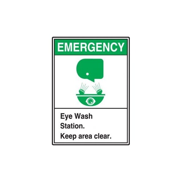 Accuform First Aid Sign, Rectangle, NO HEADER, TextSymbol Legend, EMERGENCY ANSI EYE WASH STATION KEEP AREA CLEAR GRAPHIC Legend, 004 in Aluminum, Hole Mount, 14 in Height, 10 in Width, GreenWhite on WhiteBlackSafety Signs identify and indicate potential, type and degree of hazards that may lead to accidental injury or property damage Aluminum signs withstand washdowns, harsh elements, abusive conditions and feature good chemical, abrasion and impact resistance Aluminum is excellent for indoor and outdoor usage, making it ideal for a wide variety of industrialstrength applications