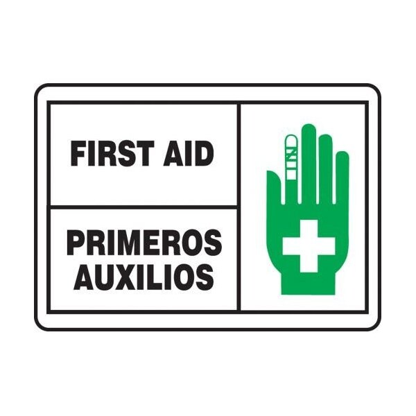 Accuform First Aid Sign, Rectangle, NO HEADER, TextSymbol Legend, FIRST AIDPRIMEROS AUXILIOS GRAPHIC Legend, 004 in Aluminum, Hole Mount, 14 in Height, 10 in Width, White on BlackSafety Signs identify and indicate potential, type and degree of hazards that may lead to accidental injury or property damage Aluminum signs withstand washdowns, harsh elements, abusive conditions and feature good chemical, abrasion and impact resistance Aluminum is excellent for indoor and outdoor usage, making it ideal for a wide variety of industrialstrength applications