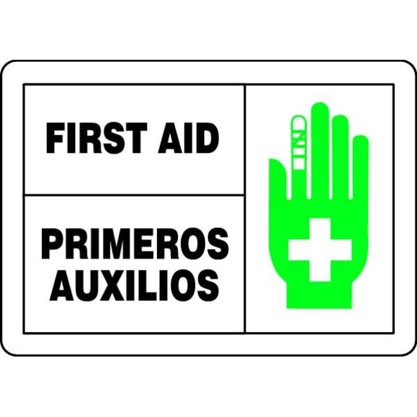Spanish-Bilingual First Aid Sign, Sign Subject Matter First Aid, Height 7 In., Width 10 In., Sign Material Vinyl, Sign Mounting Style Adhesive Surface, Header No Header, Legend First Aid/Primeros Auxilios, Printed Language English, Spanish, Sign Shape Rectangle