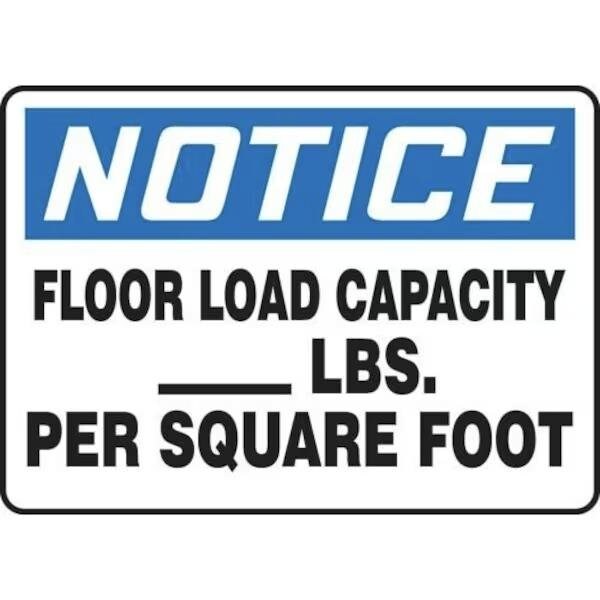 Accuform Notice Sign, Header NOTICE, Text Legend, Legend FLOOR LOAD CAPACITY LBS PER SQUARE FOOT, 6 mil Adhesive DuraVinyl, 7 in Height, 10 in WidthSafety Signs identify and indicate potential, type and degree of hazards that may lead to accidental injury or property damage Duallayered Adhesive DuraVinyl delivers exceptional flexibility and performance, outperforming standard vinyl Printed image is protected by a highgloss UV protective coating Adhesive DuraVinyl is durable, even in the toughest indoor and outdoor conditions and adheres to most smooth, curved and irregular surfaces