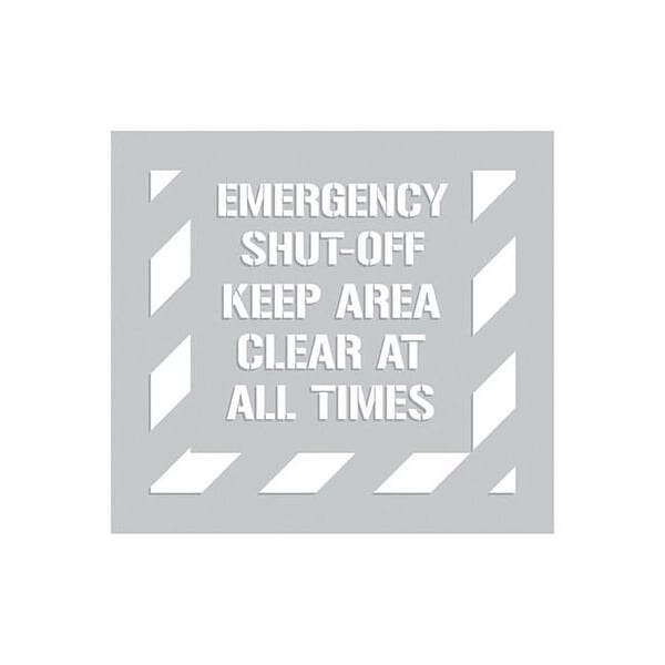 Accuform Floor Marking Stencil, EMERGENCY SHUTOFF KEEP AREA CLEAR AT ALL TIMES CharacterLegend, 338 in Character Height, 44 in Overall Height, 40 in Overall Width, 116 in Thickness, Polyethylene PlasticKeep area clear stencils identify floor and pathway areas that need to keep area clear at all times Mark locations consistently with stenciled hazard stripes and message design to show access to the area must be kept clear Place the top of the 44x40 in stencil against the wall or named item on stencil to paint the 36x36 in striped outlined clearance area and message with 338 in letters Durable and tough, the 006 in polyethylene plastic stencil is reusable to mark over and over again Easy to clean by rolling the flexible stencil to flake off dried, excess paint