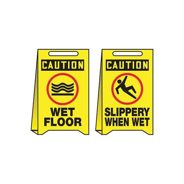 Accuform Floor Sign, Reversible, Series FoldUps, Text Legend, Legend CTN WET FLOORSLIPPERY WHEN WET, Corrugated Plastic, 20 in Height, 12 in WidthMark temporary hazards with lightweight plastic floor signs and they're reversible Reversible FoldUps provide the versatile advantage of having two signs in one Signs are printed with bold messages and symbols on the panels to warn and direct Flip and fold the sign insideout to reveal the other message, now on the outside panels Signs are made of lightweight, waterproof corrugated plastic with foldandinsert tab design to stand 20 in H x 12 in W They have a carry handle cutout on top and fold flat for transport and storage They are economically ideal for limited purposes or disposable for onetime use