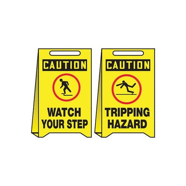 Accuform Floor Sign, Reversible, Series FoldUps, Text Legend, Legend CTN WATCH YOUR STEPTRIPPING HAZRD, Corrugated Plastic, 20 in Height, 12 in WidthMark temporary hazards with lightweight plastic floor signs and they're reversible Reversible FoldUps provide the versatile advantage of having two signs in one Signs are printed with bold messages and symbols on the panels to warn and direct Flip and fold the sign insideout to reveal the other message, now on the outside panels Signs are made of lightweight, waterproof corrugated plastic with foldandinsert tab design to stand 20 in H x 12 in W They have a carry handle cutout on top and fold flat for transport and storage They are economically ideal for limited purposes or disposable for onetime use