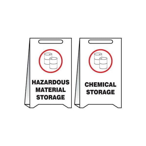 Accuform Floor Sign, Reversible, Series FoldUps, Language English, TextSymbol Legend, HAZ MAT STORAGECHEMICAL STORAGE Legend, Corrugated Plastic, 20 in Height, 12 in WidthReversible FoldUps mark temporary hazards with lightweight plastic floor signs and theyre reversible reversible FoldUps provide the versatile advantage of having two signs in one Signs are printed with bold messages and symbols on the panels to warn and direct Flip and fold the sign insideout to reveal the other message, now on the outside panels Signs are made of lightweight, waterproof corrugated plastic with foldandinserttab design to stand 20 in H x 12 in W They have a carry handle cutout on top and fold flat for transport and storage They are economically ideal for limited purposes or disposable for onetime use