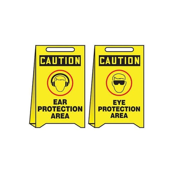 Accuform Floor Sign, Reversible, Series FoldUps, Text Legend, Legend CAUTION EAREYE PROTECTION AREA, Corrugated Plastic, 20 in Height, 12 in WidthMark temporary hazards with lightweight plastic floor signs and they're reversible Reversible FoldUps provide the versatile advantage of having two signs in one Signs are printed with bold messages and symbols on the panels to warn and direct Flip and fold the sign insideout to reveal the other message, now on the outside panels Signs are made of lightweight, waterproof corrugated plastic with foldandinsert tab design to stand 20 in H x 12 in W They have a carry handle cutout on top and fold flat for transport and storage They are economically ideal for limited purposes or disposable for onetime use