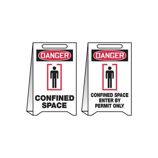 Accuform Floor Sign, Reversible, Series FoldUps, Text Legend, Legend DGR CONFINED SPACEENTER BY PERMIT, Corrugated Plastic, 20 in Height, 12 in WidthMark temporary hazards with lightweight plastic floor signs and they're reversible Reversible FoldUps provide the versatile advantage of having two signs in one Signs are printed with bold messages and symbols on the panels to warn and direct Flip and fold the sign insideout to reveal the other message, now on the outside panels Signs are made of lightweight, waterproof corrugated plastic with foldandinsert tab design to stand 20 in H x 12 in W They have a carry handle cutout on top and fold flat for transport and storage They are economically ideal for limited purposes or disposable for onetime use
