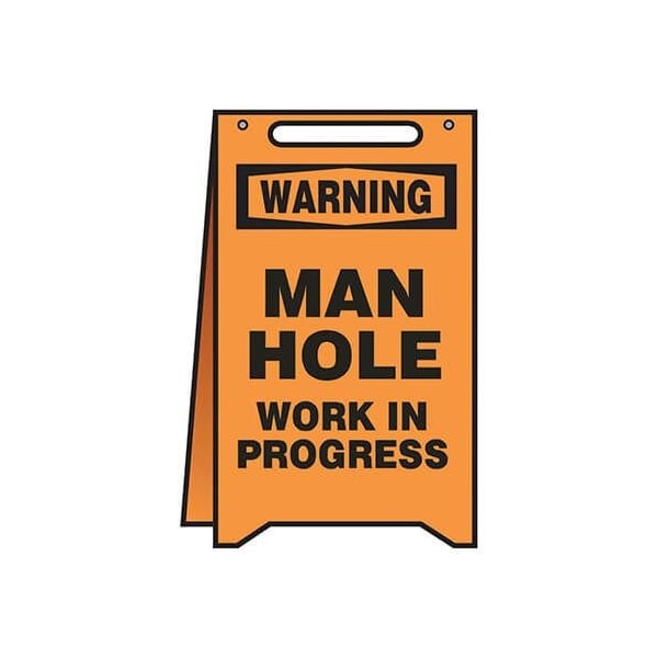 Accuform Floor Sign, Series FoldUps, Text Legend, Legend WARNING MAN HOLE WORK in PROGRESS, High Impact Plastic, 20 in Height, 12 in WidthIdentify temporary hazardous conditions or display messages quickly and easily with freestanding FoldUps Floor Signs Rugged plastic makes them ideal for multiple uses and rough handling FoldUps Floor Signs are selfsupporting and constructed of 0125 in highimpact plastic They measure 20 x 12 in, have a handle cutout for ease of carrying and fold flat for transport and storage Both sides are printed with the same message
