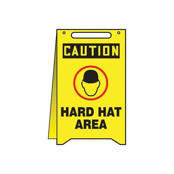 Accuform Floor Sign, Series FoldUps, Text Legend, Legend CAUTION HARD HAT AREA, High Impact Plastic, 20 in Height, 12 in WidthIdentify temporary hazardous conditions or display messages quickly and easily with freestanding FoldUps Floor Signs Rugged plastic makes them ideal for multiple uses and rough handling FoldUps Floor Signs are selfsupporting and constructed of 0125 in highimpact plastic They measure 20 x 12 in, have a handle cutout for ease of carrying and fold flat for transport and storage Both sides are printed with the same message