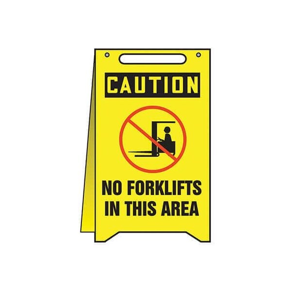 Accuform Floor Sign, Series FoldUps, Text Legend, Legend CAUTION NO FORKLIFTS IN THIS AREA, High Impact Plastic, 20 in Height, 12 in WidthIdentify temporary hazardous conditions or display messages quickly and easily with freestanding FoldUps Floor Signs Rugged plastic makes them ideal for multiple uses and rough handling FoldUps Floor Signs are selfsupporting and constructed of 0125 in highimpact plastic They measure 20 x 12 in, have a handle cutout for ease of carrying and fold flat for transport and storage Both sides are printed with the same message