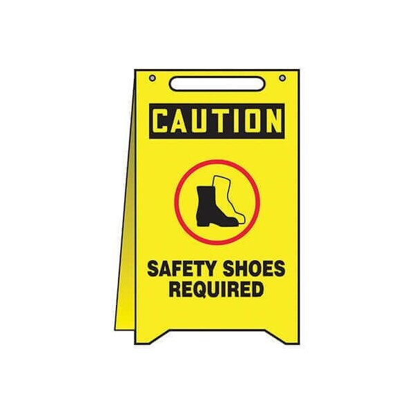 Accuform Floor Sign, Series FoldUps, Text Legend, Legend CAUTION SAFETY SHOES REQUIRED, High Impact Plastic, 20 in Height, 12 in WidthIdentify temporary hazardous conditions or display messages quickly and easily with freestanding FoldUps Floor Signs Rugged plastic makes them ideal for multiple uses and rough handling FoldUps Floor Signs are selfsupporting and constructed of 0125 in highimpact plastic They measure 20 x 12 in, have a handle cutout for ease of carrying and fold flat for transport and storage Both sides are printed with the same message
