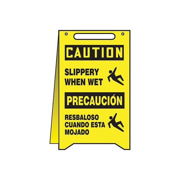 Accuform Floor Sign, Series FoldUps, Text Legend, Legend CAUTION SLIPPERY WHEN WET PRECAUCION RESBALOSO, High Impact Plastic, 20 in Height, 12 in WidthIdentify temporary hazardous conditions or display messages quickly and easily with freestanding FoldUps Floor Signs Rugged plastic makes them ideal for multiple uses and rough handling FoldUps Floor Signs are selfsupporting and constructed of 0125 in highimpact plastic They measure 20 x 12 in, have a handle cutout for ease of carrying and fold flat for transport and storage Both sides are printed with the same message