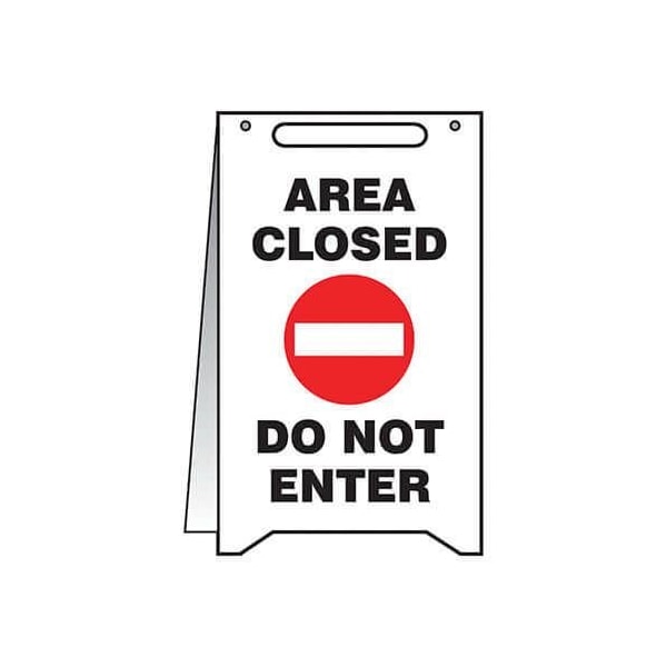 Accuform Floor Sign, Series FoldUps, Text Legend, Legend AREA CLOSED DO NOT ENTER, High Impact Plastic, 20 in Height, 12 in WidthIdentify temporary hazardous conditions or display messages quickly and easily with freestanding FoldUps Floor Signs Rugged plastic makes them ideal for multiple uses and rough handling FoldUps Floor Signs are selfsupporting and constructed of 0125 in highimpact plastic They measure 20 x 12 in, have a handle cutout for ease of carrying and fold flat for transport and storage Both sides are printed with the same message