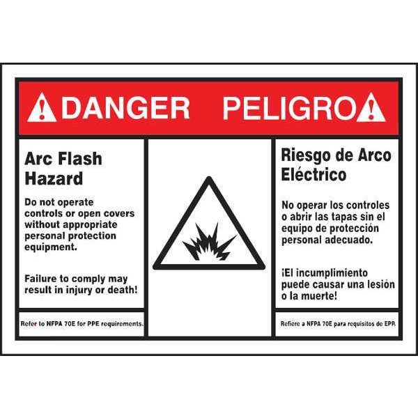 Label, Horizontal Rectangle, Number of Printed Sides 1, English, Spanish, Sign Format ANSI/OSHA Format, Sign Legend Arc Flash And Shock Hazard Do Not Operate Controls Or Open Covers Without Appropriate Personal Protection Equipment. Failure To Comply May Result In Injury Or Death! Refer To NFPA 70E For Minimum Requirements, Sign Legend Background Color White, Sign Legend Style Symbol and Text