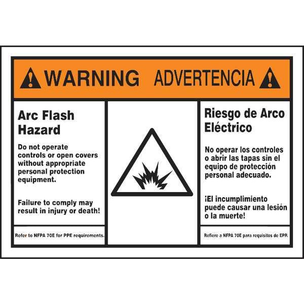 Label, Horizontal Rectangle, Number of Printed Sides 1, English, Spanish, Sign Format ANSI/OSHA Format, Sign Legend Arc Flash Hazard Do Not Operate Controls Or Open Covers Without Appropriate Personal Protection Equipment. Failure To Comply May Result In Injury Or Death! Refer To Nfpa 70E For Minimum Requirements(Bilingual), Sign Legend Background Color White, Sign Legend Style Symbol and Text