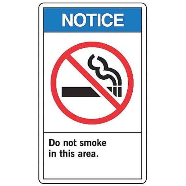 Safety Label, Vertical Rectangle, Number of Printed Sides 1, English, Sign Format ANSI/OSHA Format, Sign Legend Do Not Smoke In This area, Sign Legend Background Color White, Sign Legend Style Symbol and Text, Package Quantity 5