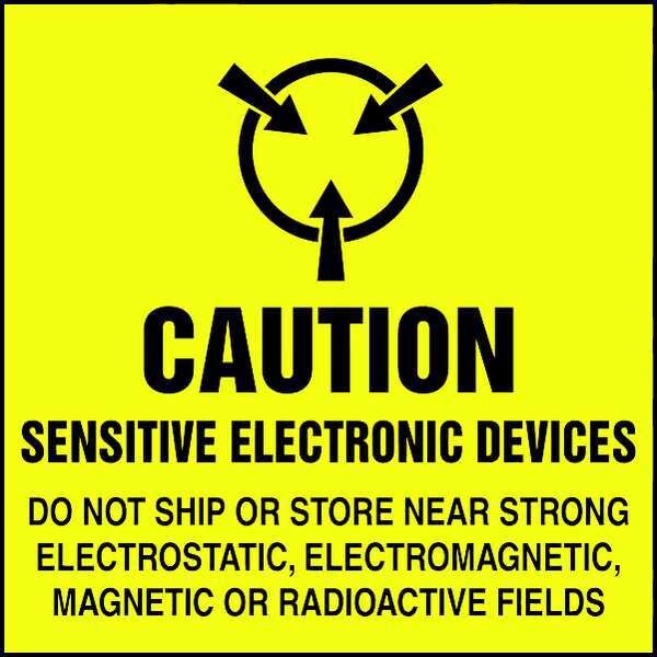 Label, Vertical Rectangle, English, Sign Legend Caution Sensitive Electronic Devices Do Not Ship or Store Near Strong Electrostatic, Electromagnetic, Magnetic or Radioactive Fields, Sign Legend Background Color Yellow, Sign Legend Style Symbol and Text, Package Quantity 500