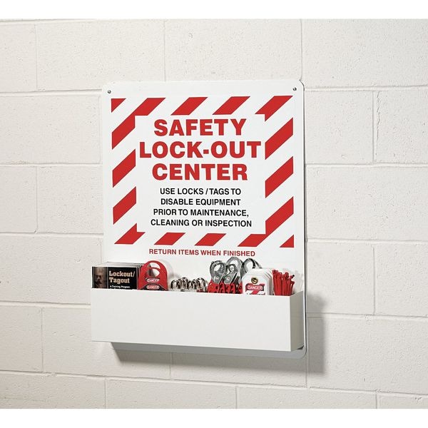 Lockout Board, Cable Lockouts Included Not Applicable, Cover Type Open Front, Electrical Lockouts Included Not Applicable, Filled No, Number of Hasps Included 7, Number of Lockouts Included 0, Number of Padlocks Included 0, Number of Tags Included 0, Visibility Inside Board Only, Language English, Mount Type Wall Mount, Background Color Red, White, Includes (1) Pocket, Legend Safety Lock-Out Center, Legend Type Text, Material Aluminum, Mounting Location Wall, Number of Padlocks Held 6