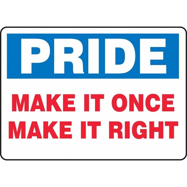 Motivational Safety Sign, Sign Subject Matter Safety Incentive and Motivational, Height 10 In., Width 14 In., Sign Material Vinyl, Sign Mounting Style Adhesive Surface, Header No Header, Legend Pride Make It Once Make It Right, Printed Language English, Sign Shape Rectangle