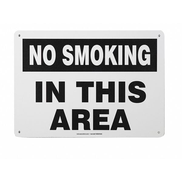 No Smoking Sign, Sign Subject Matter No Smoking, Height 10 in, Width 14 in, Sign Material Aluminum, Sign Mounting Style With Mounting Holes, Header No Header, Legend No Smoking In This Area, Printed Language English, Sign Shape Rectangle