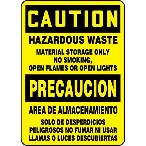 No Smoking Sign, Sign Subject Matter No Smoking, Height 14 in, Width 10 in, Sign Material Plastic, Sign Mounting Style With Mounting Holes, Header Caution/Precaucion, Legend Hazardous Waste Material Storage Only No Smoking, Open Flames Or Open Lights/Area De Almacenamiento Solo De Desperdicios Peligrosos No Fumar Ni Usar Llamas O Luces Descubiertas, Printed Language English, Spanish, Sign Shape Rectangle