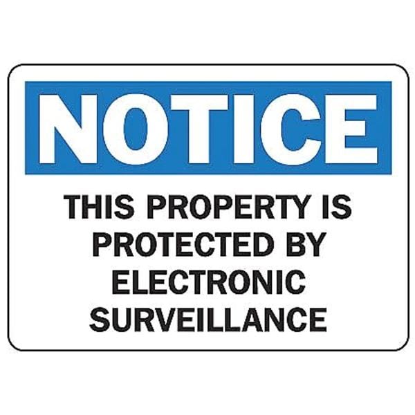 Notice Sign, Sign Subject Matter Security and Surveillance, Height 10 in, Width 14 in, Sign Material Aluminum, Sign Mounting Style With Mounting Holes, Header Notice, Legend This Property Is Protected By Electronic Surveillance, Printed Language English, Sign Shape Rectangle