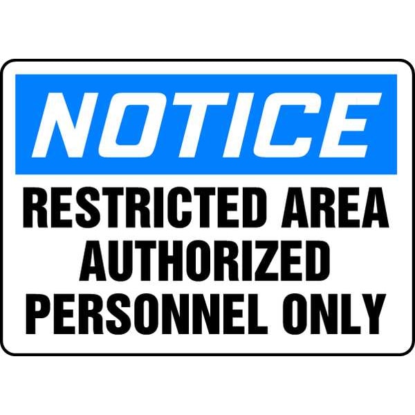 Notice Sign, Sign Subject Matter Authorized Personnel and Restricted Access, Height 7 in, Width 10 in, Sign Material Vinyl, Sign Mounting Style Adhesive Surface, Header Notice, Legend Restricted Area Authorized Personnel Only, Printed Language English, Sign Shape Rectangle