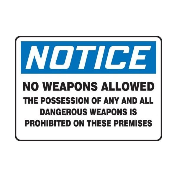 Accuform Notice Sign, Header NOTICE, Text Legend, Legend NO WEAPONS ALLOWED THE POSSESSION OF ANY AND ALL DANGEROUS WEAPONS IS PROHIBITED ON THESE PREMISES, 0055 in Plastic, Hole Mounting, 7 in Height, 10 in Width, Black on white SignWhite on Blue Header LegendBackgroundSafety Signs identify and indicate potential, type and degree of hazards that may lead to accidental injury or property damage Plastic signs are semiflexible, made with 50 recycled content and ideal for indoor and shortterm, sheltered outdoor environments Plastic signs feature good impact resistance, UV inhibitors and enough flex to mount on slightly curved areas