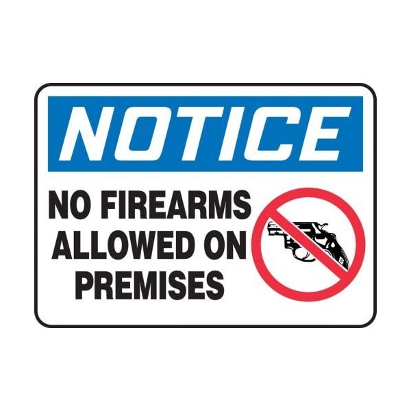 Accuform Notice Sign, NOTICE Header, TextSymbol Legend, NO FIREARMS ALLOWED ON PREMISES GRAPHIC Legend, 4 mil Adhesive Vinyl, Adhesive Surface Mount, 10 in Height, 14 in Width, Black on White SignWhite on Blue HeaderSafety Signs identify and indicate potential, type and degree of hazards that may lead to accidental injury or property damage Adhesive Vinyl is the ideal choice for a variety of indoor and sheltered outdoor, marking needs Easily mounts to all curved areas such as pipes, poles and secondary containers Adhesive Vinyl signs feature a printed matte surface, moistureresistance and scored backing for quick peeloff and application