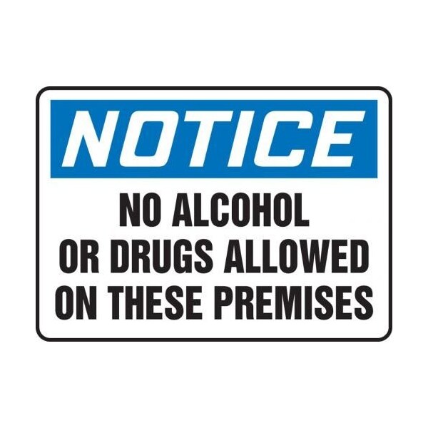 Accuform Notice Sign, Rectangle, Header NOTICE, Text Legend, Legend NO ALCOHOL OR DRUGS ALLOWED ON THESE PREMISES, 004 in Aluminum, 7 in Height, 10 in Width, BlackBlueWhite LegendBackgroundSafety Signs identify and indicate potential, type and degree of hazards that may lead to accidental injury or property damage Aluminum signs withstand washdowns, harsh elements, abusive conditions and feature good chemical, abrasion and impact resistance Aluminum is excellent for indoor and outdoor usage, making it ideal for a wide variety of industrialstrength applications