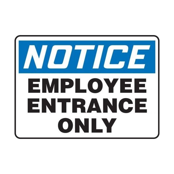 Accuform Notice Sign, Header NOTICE, Text Legend, Legend EMPLOYEE ENTRANCE ONLY, 0055 in Plastic, Hole Mounting, 10 in Height, 14 in Width, Black on white SignWhite on Blue Header LegendBackgroundSafety Signs identify and indicate potential, type and degree of hazards that may lead to accidental injury or property damage Plastic signs are semiflexible, made with 50 recycled content and ideal for indoor and shortterm, sheltered outdoor environments Plastic signs feature good impact resistance, UV inhibitors and enough flex to mount on slightly curved areas