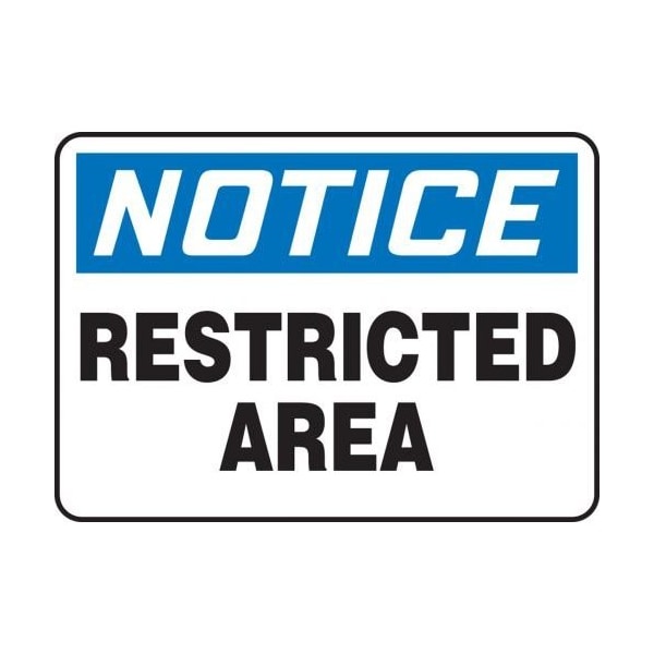 Accuform Notice Sign, Header NOTICE, Text Legend, Legend RESTRICTED AREA, 004 in Aluminum, Hole Mounting, 10 in Height, 14 in Width, Black on white SignWhite on Blue Header LegendBackgroundSafety Signs identify and indicate potential, type and degree of hazards that may lead to accidental injury or property damage Aluminum signs withstand washdowns, harsh elements, abusive conditions and feature good chemical, abrasion and impact resistance Aluminum is excellent for indoor and outdoor usage, making it ideal for a wide variety of industrialstrength applications
