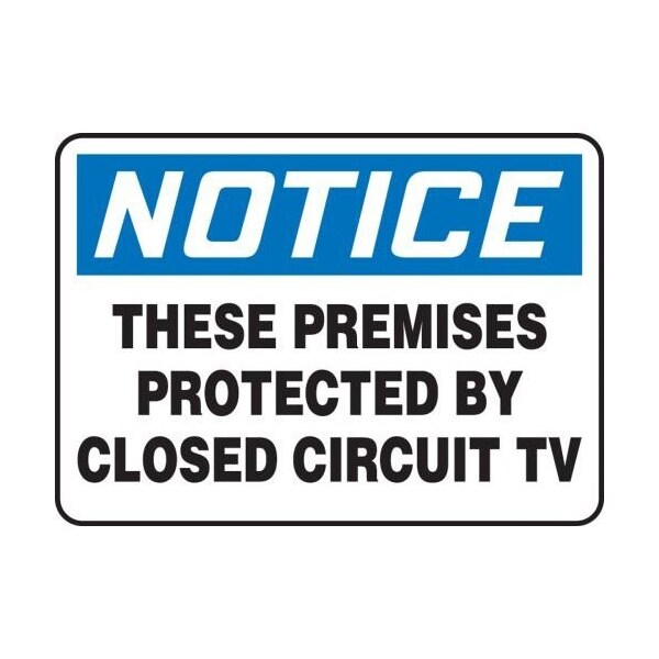 Accuform Notice Sign, Header NOTICE, Text Legend, Legend THESE PREMISES PROTECTED BY CLOSED CIRCUIT TV, 0055 in Plastic, Hole Mounting, 10 in Height, 14 in Width, Black on white SignWhite on Blue Header LegendBackgroundSafety Signs identify and indicate potential, type and degree of hazards that may lead to accidental injury or property damage Plastic signs are semiflexible, made with 50 recycled content and ideal for indoor and shortterm, sheltered outdoor environments Plastic signs feature good impact resistance, UV inhibitors and enough flex to mount on slightly curved areas
