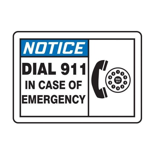 Accuform Notice Sign, NOTICE Header, Language English, TextSymbol Legend, DIAL 911 in CASE OF EMERGENCY GRAPHIC Legend, Aluminum, Surface Mount, 10 in Height, 14 in Width, BlackWhite on BlueWhiteChoose your safety signs and safety labels from custom or stock No minimum quantities are required, no set up fees and most importantly no additional charge for colors or logos Once you find the safety sign or safety label that delivers the information or warning message you need, consider having your custom or stock order shipped within 24 hr