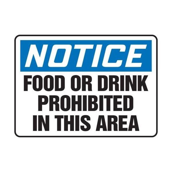 Accuform Notice Sign, Rectangle, Header NOTICE, Text Legend, Legend FOOD OR DRINK PROHIBITED IN THIS AREA, 004 in Aluminum, 10 in Height, 14 in Width, BlackBlueWhite LegendBackgroundSafety Signs identify and indicate potential, type and degree of hazards that may lead to accidental injury or property damage Aluminum signs withstand washdowns, harsh elements, abusive conditions and feature good chemical, abrasion and impact resistance Aluminum is excellent for indoor and outdoor usage, making it ideal for a wide variety of industrialstrength applications