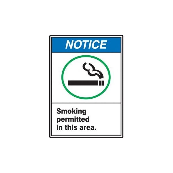 Accuform Notice Sign, Rectangle, NOTICE Header, TextSymbol Legend, ANSI SMOKING PERMITTED IN THIS AREA GRAPHIC Legend, 4 mil Adhesive Vinyl, Adhesive Surface Mount, 14 in Height, 10 in Width, BlackBlueWhiteSafety Signs identify and indicate potential, type and degree of hazards that may lead to accidental injury or property damage Adhesive Vinyl is the ideal choice for a variety of indoor and sheltered outdoor, marking needs Easily mounts to all curved areas such as pipes, poles and secondary containers Adhesive Vinyl signs feature a printed matte surface, moistureresistance and scored backing for quick peeloff and application
