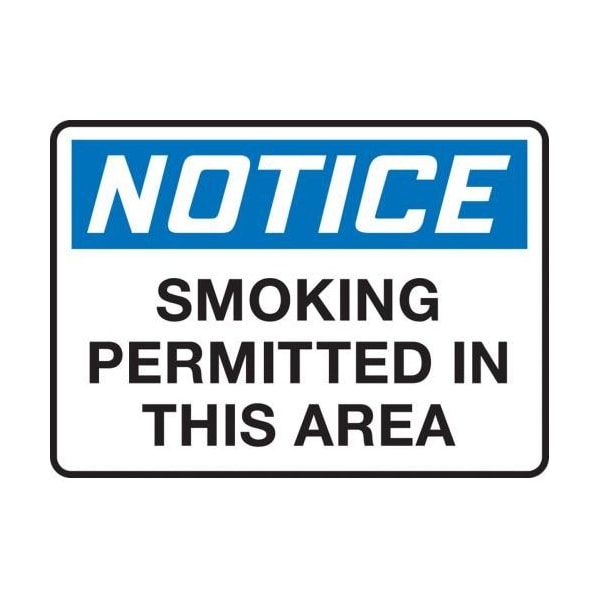Accuform Notice Sign, Rectangle, Header NOTICE, Text Legend, Legend SMOKING PREMITTED IN THIS AREA, 4 mil Adhesive Vinyl, Adhesive Surface Mounting, 10 in Height, 14 in Width, BlackBlueWhite LegendBackgroundSafety Signs identify and indicate potential, type and degree of hazards that may lead to accidental injury or property damage Adhesive Vinyl is the ideal choice for a variety of indoor and sheltered outdoor, marking needs Easily mounts to all curved areas such as pipes, poles and secondary containers Adhesive Vinyl signs feature a printed matte surface, moistureresistance and scored backing for quick peeloff and application