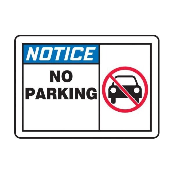 Accuform Notice Sign, Rectangle, NOTICE Header, TextSymbol Legend, NO PARKING GRAPHIC Legend, 4 mil Adhesive Vinyl, Adhesive Surface Mount, 10 in Height, 14 in Width, White on BlueSafety Signs identify and indicate potential, type and degree of hazards that may lead to accidental injury or property damage Adhesive Vinyl is the ideal choice for a variety of indoor and sheltered outdoor, marking needs Easily mounts to all curved areas such as pipes, poles and secondary containers Adhesive Vinyl signs feature a printed matte surface, moistureresistance and scored backing for quick peeloff and application