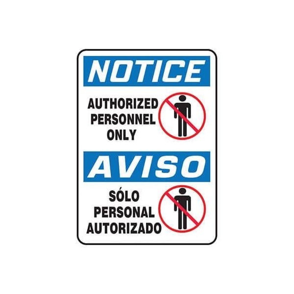 Accuform Notice Sign, Bilingual, NOTICEAVISO Header, TextSymbol Legend, AUTHORIZED PERSONNEL ONLYSOLO PERSONAL AUTORIZADO GRAPHIC Legend, 0055 in Plastic, Hole Mount, 14 in Height, 10 in Width, Black on White SignWhite on Blue HeaderSafety Signs identify and indicate potential, type and degree of hazards that may lead to accidental injury or property damage Plastic signs are semiflexible, made with 50 recycled content and ideal for indoor and shortterm, sheltered outdoor environments Plastic signs feature good impact resistance, UV inhibitors and enough flex to mount on slightly curved areas