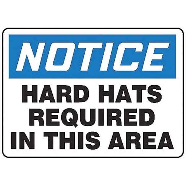 Notice Sign, Sign Subject Matter Personal Protection, Height 10 in, Width 14 in, Sign Material Vinyl, Sign Mounting Style Adhesive Surface, Header Notice, Legend Hard Hats Required In This Area, Printed Language English, Sign Shape Rectangle
