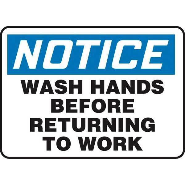Notice Sign, Sign Subject Matter Wash Hands, Height 7 In., Width 10 In., Sign Material Plastic, Sign Mounting Style With Mounting Holes, Header Notice, Legend Wash Hands Before Returning To Work, Printed Language English, Sign Shape Rectangle