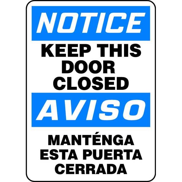 Spanish-Bilingual Notice Sign, Sign Subject Matter Door Instruction, Height 14 In., Width 10 In., Sign Material Aluminum, Sign Mounting Style With Mounting Holes, Header Notice/Aviso, Legend Keep This Door Closed/Mantenga Esta Puerta Cerrada, Printed Language English, Spanish, Sign Shape Rectangle