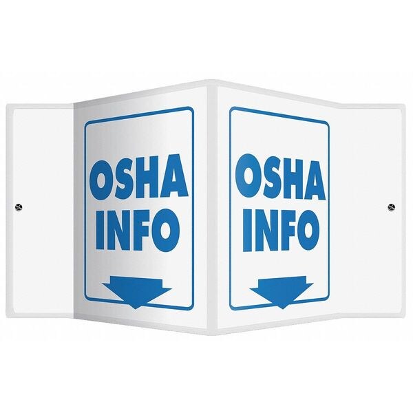V-Shape Projection Sign, Sign Subject Matter Information, Height 6 In., Width 8-1/2 In., Sign Material Plastic, Sign Mounting Style With Mounting Holes, V-Shaped, Header No Header, Legend OSHA Info, Printed Language English, Sign Shape V-Shaped